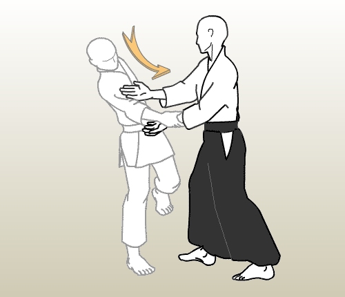 Tori contourne Uke grâce à un TaiSabaki (donc, durant