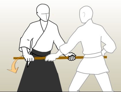 Fig. Naname - 3 : Tout en continuant sa traction du Jo avec sa main droite, Tori engage son bras gauche et déséquilibre Uke vers l'arrière. |