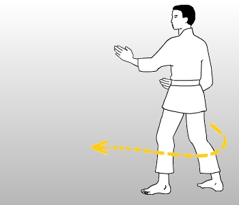 Durant la rotation le pied arrière (ici le pied droit) glisse sous le corps de manière rectiligne, assurant un léger soutien (en général, c'est cette forme qui est pratiquée en Aikido). Dans d'autres arts martiaux, le pied (ici : pied droit) peut décrire un demi-cercle vers l'arrière (comme la pointe traçante d'un compas) : l'élan donné par le bassin entraîne alors plus facilement le pivot. |